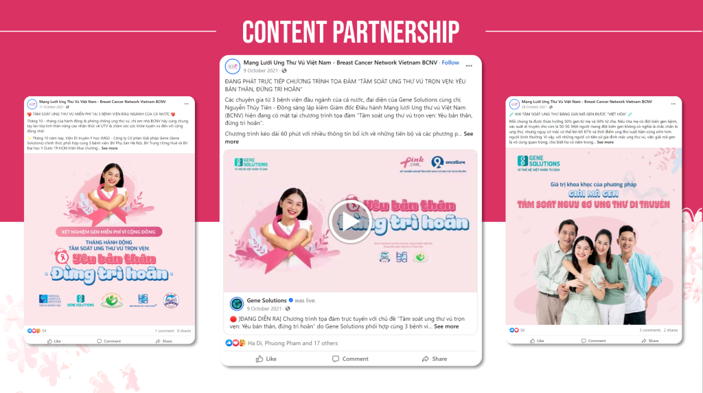 Leveraging the KOL voice and fanbase through her self – experience genetic testing service for hereditary breast cancer risk and shared testimonials on social media channels. This tactic not only enhanced brand awareness but also encouraged the “Yêu bản thân đừng trì hoãn -Self love without delay” mentality with a more relatable voice of the KOLs.