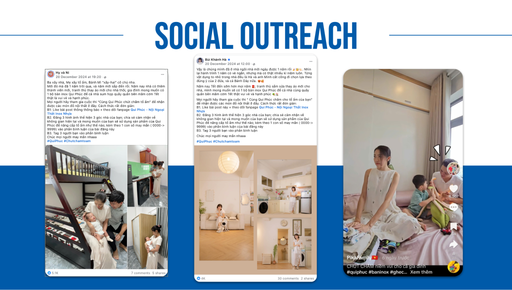The IMC campaign successfully reinforced brand love and product relevance through a strategic mix of Social Outreach, Social Content, and PR storytelling. The campaign exceeded expectations across all channels. With high-performing, Qui Phúc not only boosted visibility but also deepened engagement with its core audience on Facebook, YouTube, and top-tier online media.