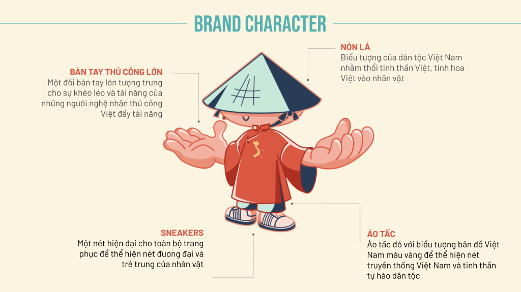 KV kết hợp các biểu tượng văn hoá Việt (nón lá, áo dài, bản đồ) với ngôn ngữ thị giác trẻ trung, tạo nên phong cách giao thoa giữa chất retro và hơi thở hiện đại. Nhân vật đại diện mang thiết kế thuần Việt, với đôi tay lớn biểu trưng cho bàn tay nghệ nhân, được đặt ở trung tâm visual để spotlight nhân vật và làm nổi bật tinh thần “Uniquely Vietnam – Chus for You.