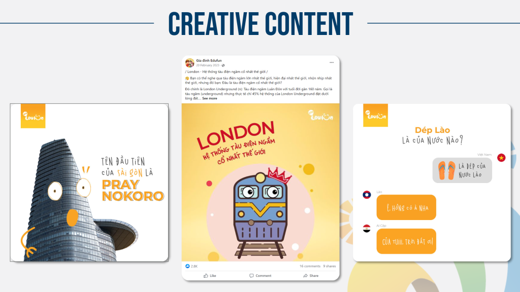Hướng tới mục tiêu “Vui học toàn diện,” chúng tôi đã xây dựng chuỗi nội dung sáng tạo và hài hước trên fanpage Edufun. Những bài viết và video này giúp học sinh tiếp thu kiến thức một cách thú vị hơn, kết hợp giáo dục với giải trí để tạo động lực học tập và sự hào hứng trong mỗi bài học.